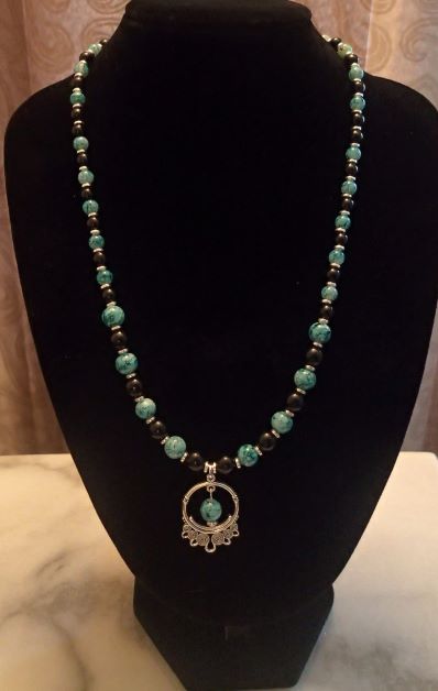 This delicate necklace is made with glass beads (8 mm and 6 mm). Colour of beads is teal opaque and black with silver plated accents. Approximately 21 1/2 inches or 55 cm long.