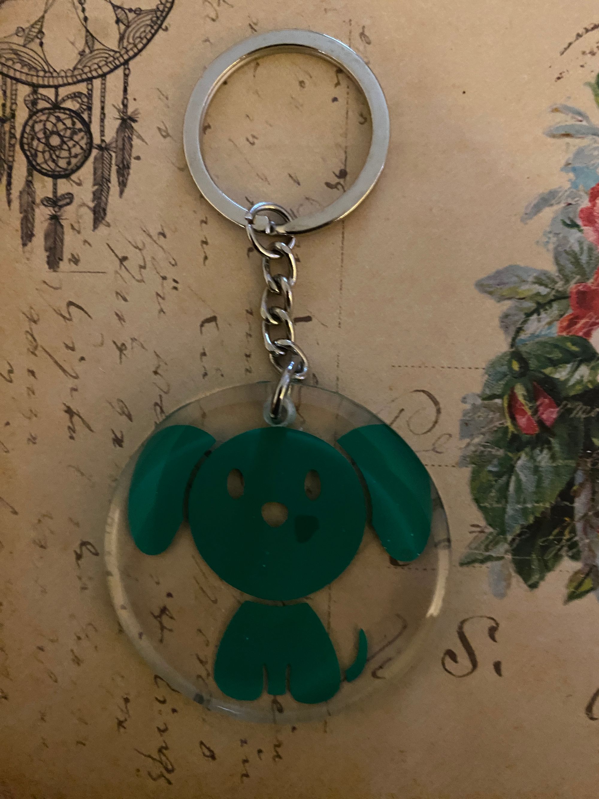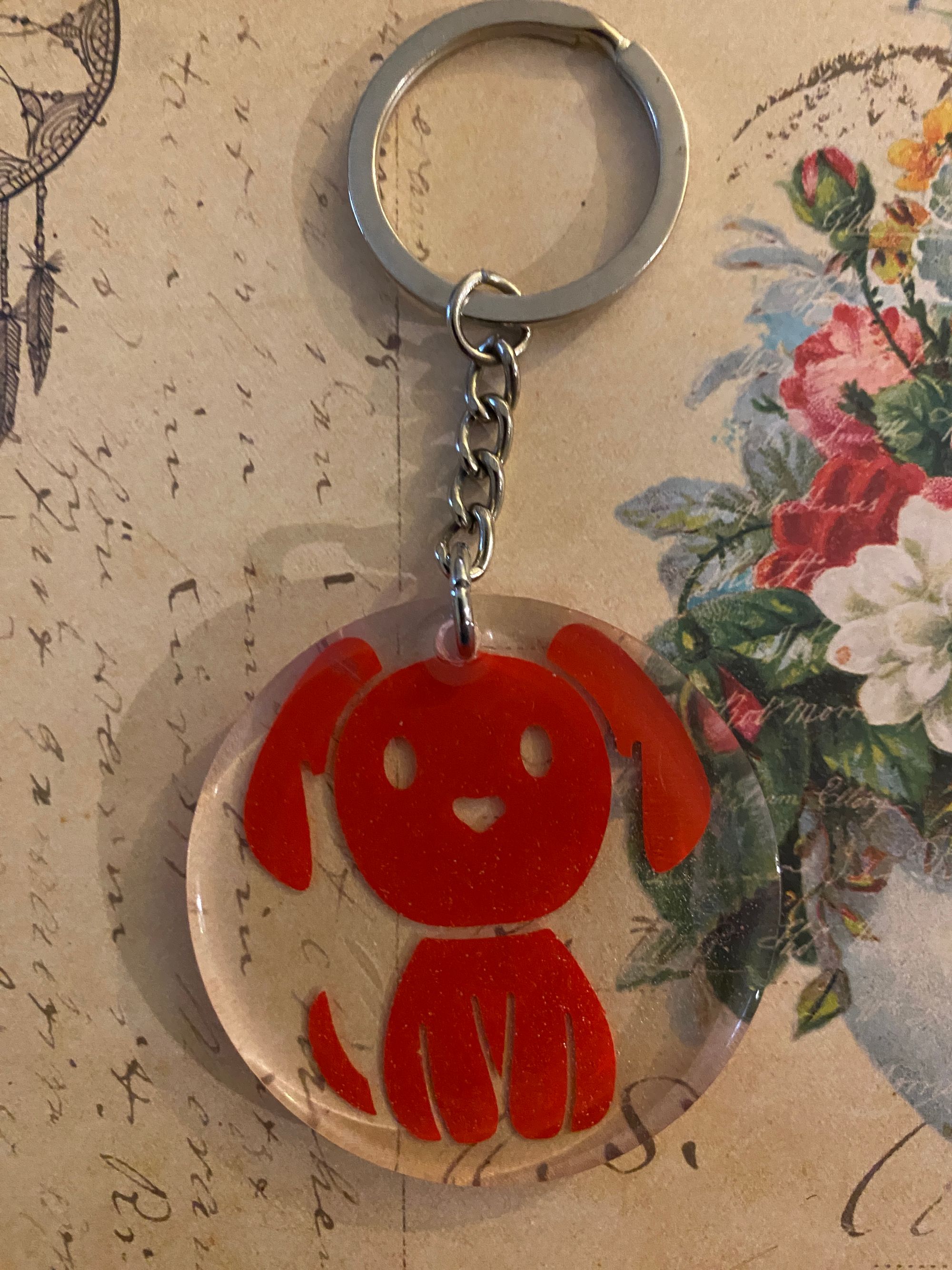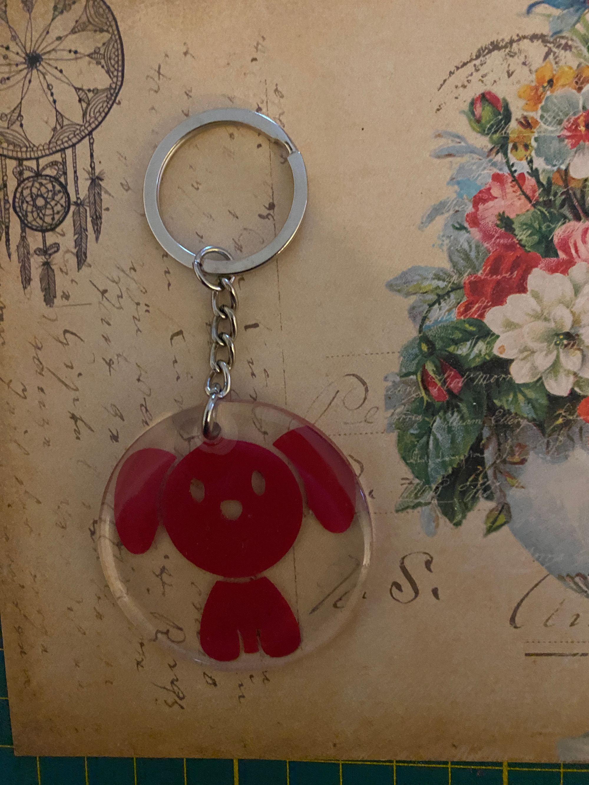 The key chain is made from plastic, vinyl and resin. The keychain is about 4 inches long and the decorative part is 2 inches in diameter.