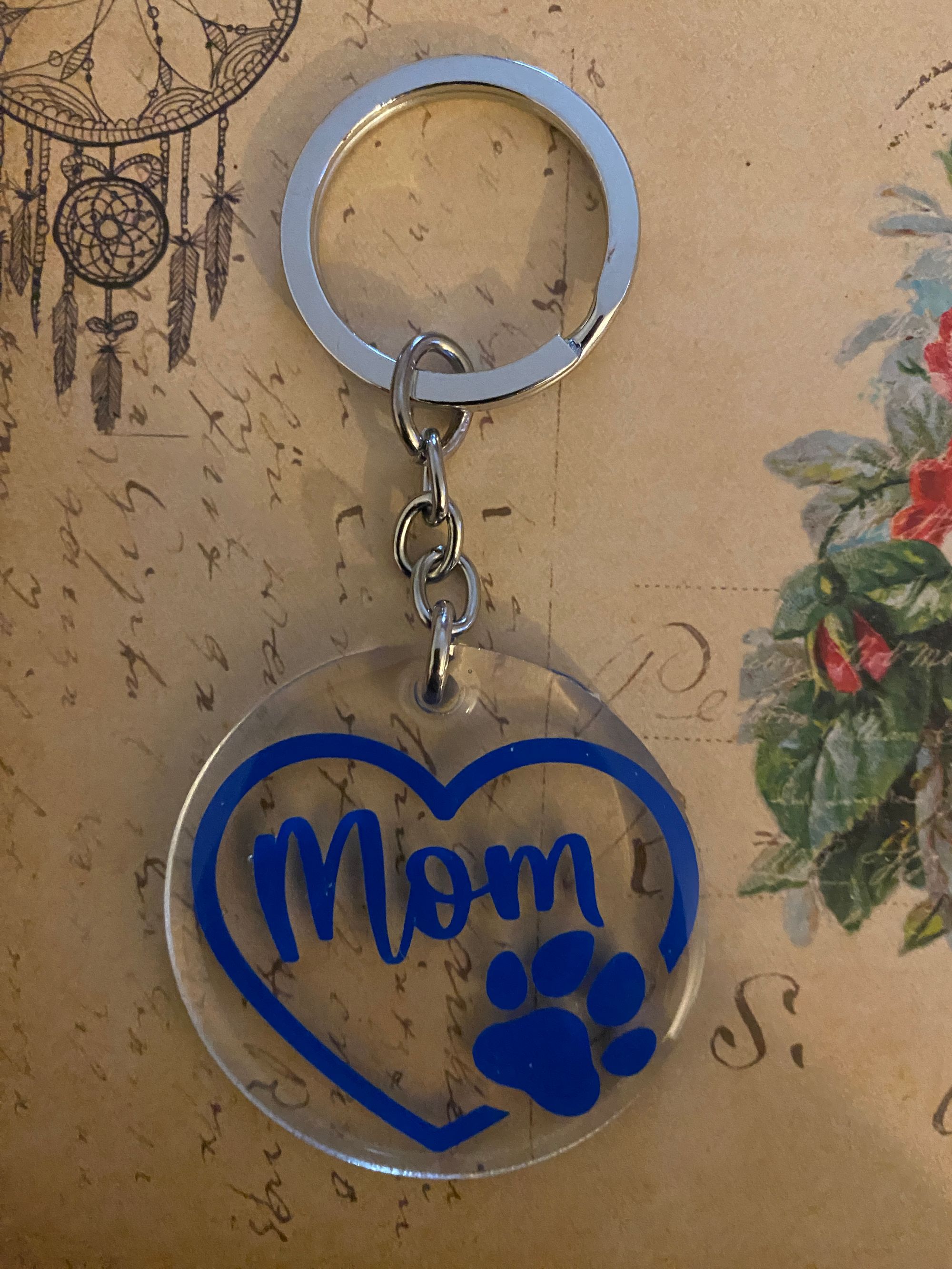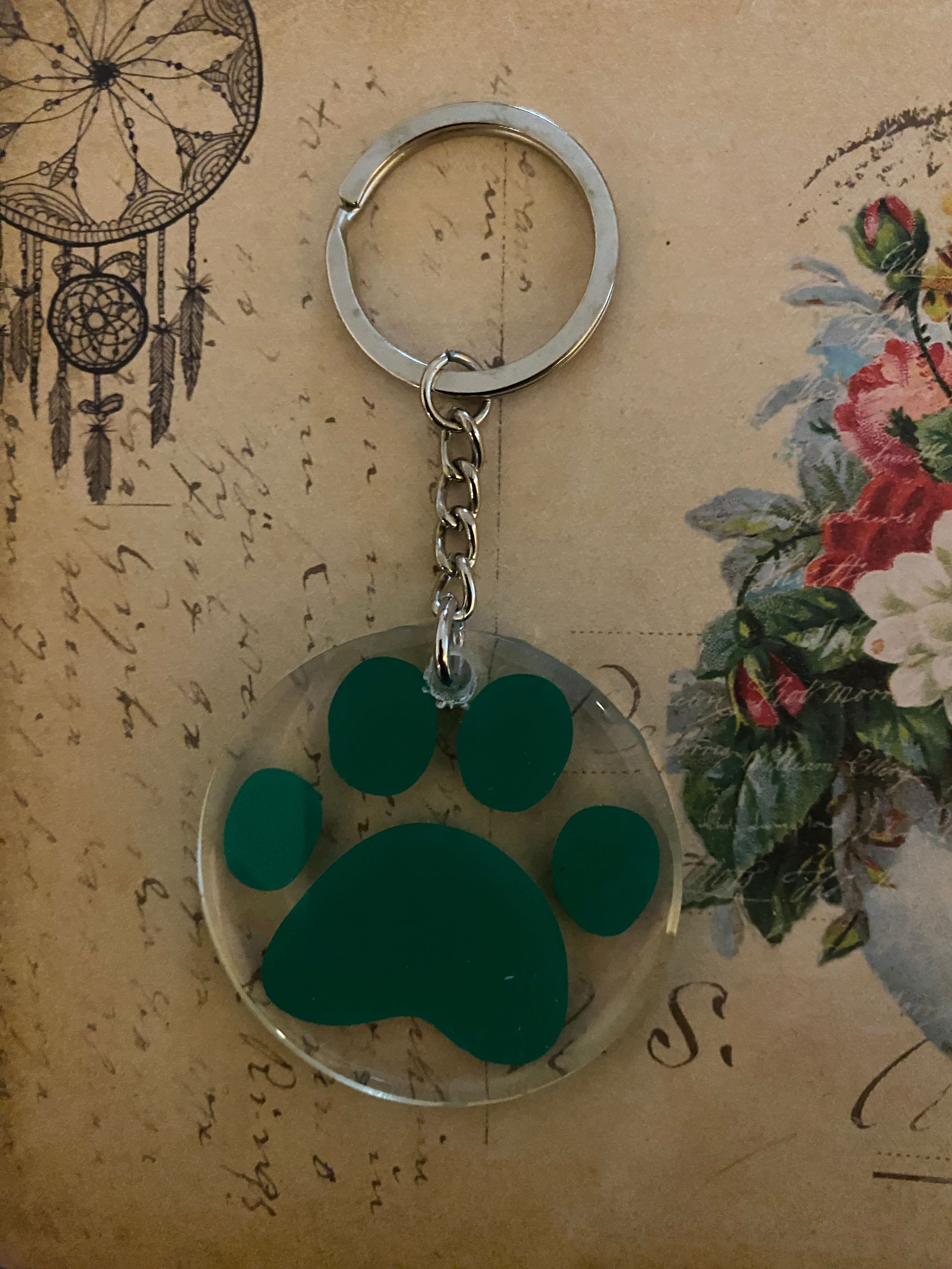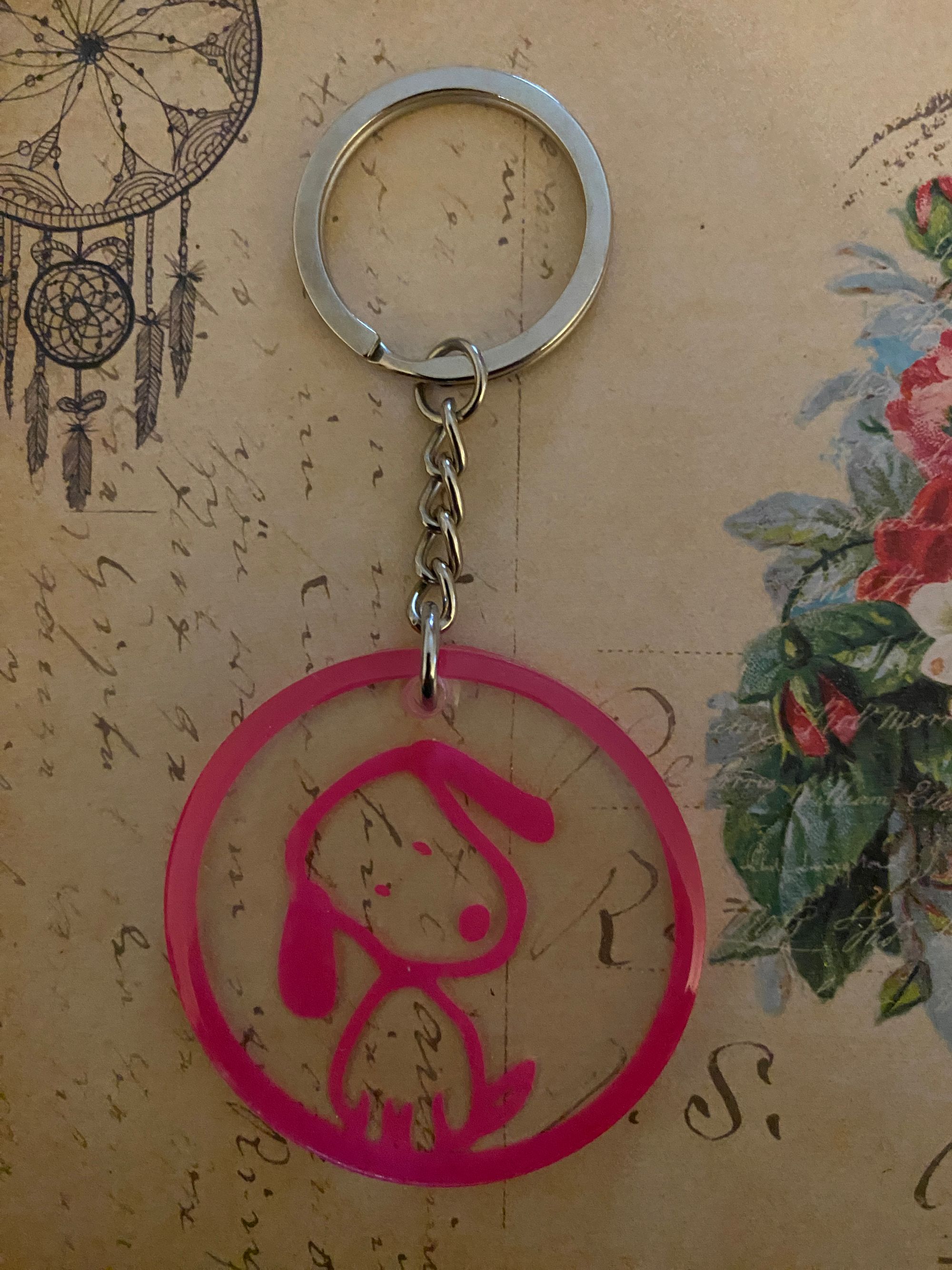 The key chain is made from plastic, vinyl and resin. The keychain is about 4 inches long and the decorative part is 2 inches in diameter.