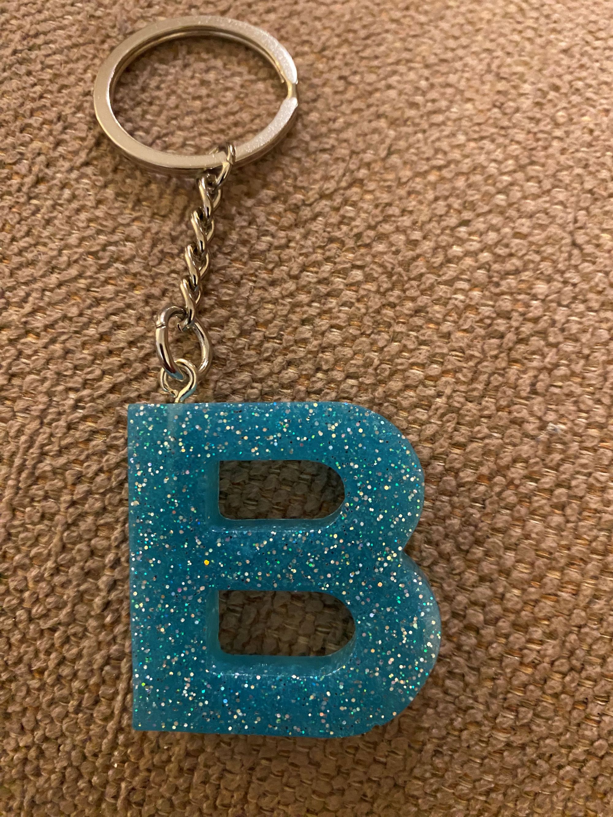 Personalized alphabet resin keychains on a silver key ring.